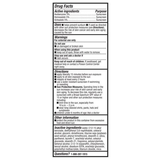 Actives: Avobenzone 3%, Homosalate 5%, Octisalate 5% Inactives: Water, C12-15 Alkyl Benzoate, Diethylhexyl 2,6-Naphthalate, Cetearyl Alcohol, Glycerin, Dimethicone, Glycine Soja (Soybean) Seed Extract, Phenyl Trimethicone, Steareth-2, Silica, Panthenol, Laureth-7, Arachidyl Alcohol, Cetearyl Glucoside, Steareth-21, Fragrance, Polyacrylamide, Behenyl Alcohol C13-14 lsoparaffin, Chlorphenesin, Benzyl Alcohol, Disodium EDTA, Arachidyl Glucoside, Polymethyl Methacrylate, Titanium Dioxide, Mica