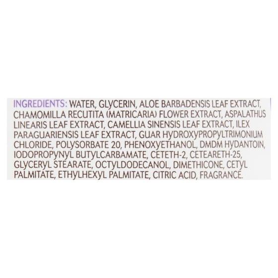 Water, glycerin, aloe barbadensis leaf extract, chamomilla recutita (matricaria) flower extract, aspalathus linearis leaf extract, camellia sinensis leaf extract, ilex paraguariensis leaf extract, guar hydroxypropyltrimonium chloride, polysorbate 20, phenoxyethanol, dmdm hydantoin, iodopropynyl butylcarbamate, ceteth-2, cetearate-25, glyceryl stearate, octyldodecanol, dimethicone, ceryl palmitate, ethylhexyl palmitate, citric acid, fragrance