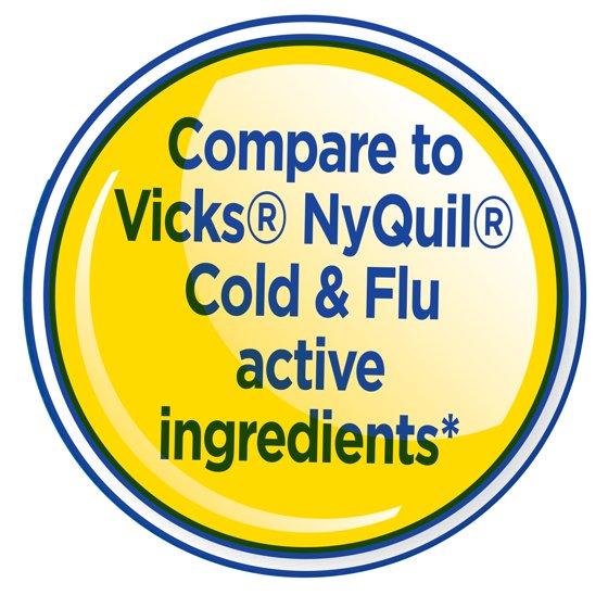 - Active Ingredients: Compare to the active ingredients of Vicks NyQuil Cold and Flu, Acetaminophen 650 mg, Dextromethorphan HBr 30 mg and Doxylamine Succinate 12.5 mg