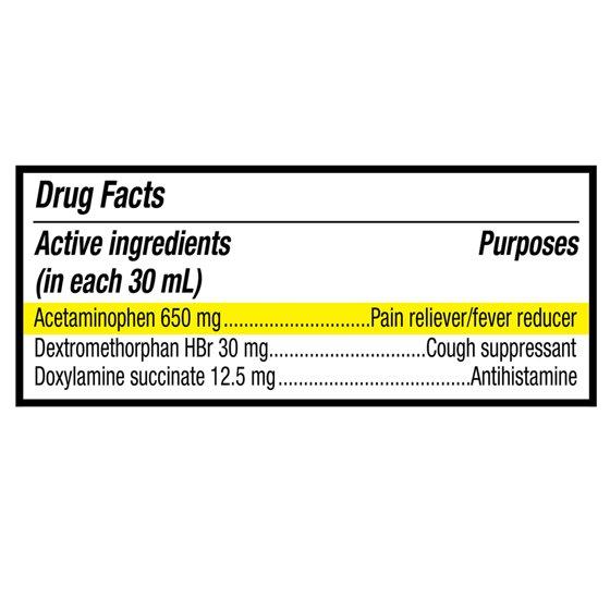 Active Ingredients: Acetaminophen 650 mg, Dextromethorphan HBr 30 mg, Doxylamine succinate 12.5 mg. Inactive ingredients: acesulfame potassium, alcohol, citric acid, FD&C blue #1, FD&C red #40, flavor, high fructose corn syrup, polyethylene glycol, propylene glycol, purified water, saccharin sodium, sodium citrate
