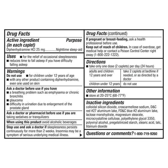 - Active ingredient (in each caplet): Diphenhydramine HCI, 25 mg