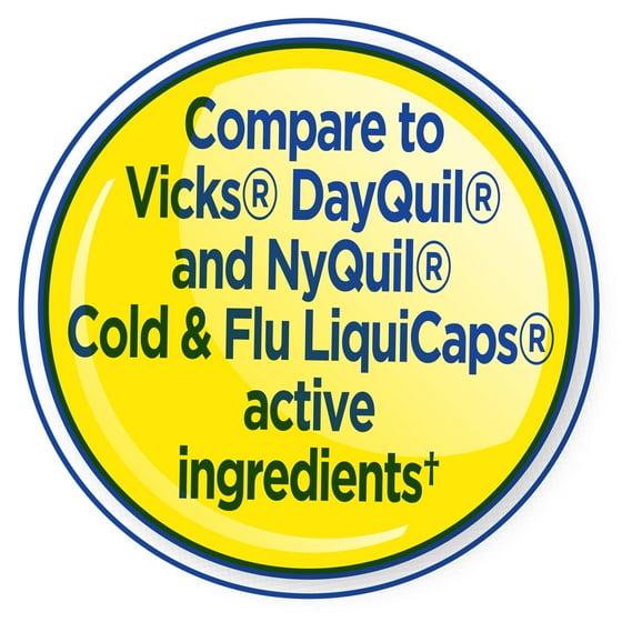 - Compares to Vicks® DayQuil® and NyQuil® Cold and Flu LiquiCaps® active ingredients