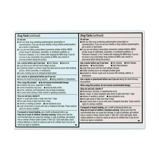 - Nighttime contains Acetaminophen 325 mg, Dextromethorphan HBr 10 mg, and Doxylamine succinate 6.25 mg