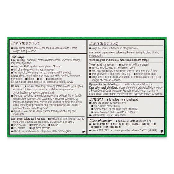 Active Ingredients: In Each Caplet Acetaminophen (325 mg), Guaifenesin (200 mg), Phenylephrine HCl (5 mg). Purpose: Pain Reliever/Fever Reducer, Expectorant, Nasal Decongestant. Inactive Ingredients: Corn Starch, Crospovidone, Flavor, Magnesium Stearate, Maltodextrin, Microcrystalline Cellulose, Polyethylene Glycol, Polyvinyl Alcohol, Povidone, Silicon Dioxide, Sodium Starch Glycolate, Stearic Acid, Sucralose, Talc, Titanium Dioxide..