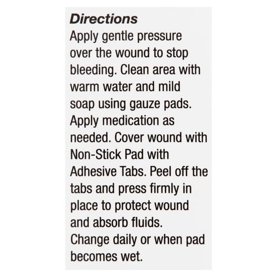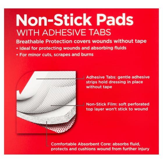 Equate Non-Stick Pads with Adhesive Tabs cushion and protect minor cuts, scrapes, and burns. Covered wounds heal faster than ones left uncovered. These cushioned pads protect and insulate against further injury, have a soft, breathable, perforated top layer that allows air to circulate, and a non-stick film that will not adhere to your wound. Our pads also feature an absorbent core that retains fluids, keeping the injury clean and dry. The easy application adhesive tabs bond quickly to the skin while gently holding the dressing in place. To use, clean the affected area with warm water and mild soap. Apply medication as needed and cover the wound with the peel-off, non-stick pads. For less pain and more healing use Equate Non-Stick Pads with Adhesive Tabs.