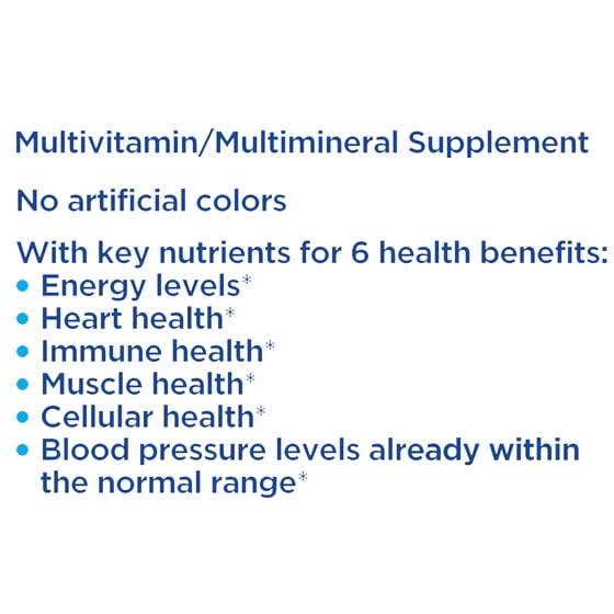 Our Equate One Daily Men's Health Multivitamin/Multimineral Supplement Tablets are formulated to help support men’s heart health with vitamins B6, B12, and folic Acid, immune health with vitamins A, C and E, and energy levels with B-vitamins.* This formula contains no lactose, gluten, artificial colors or flavors. Simply take one tablet a day with food to help supplement key daily nutrients. Start living a nutrient-filled life today with Equate One Daily Men's Health Multivitamin Tablets!*