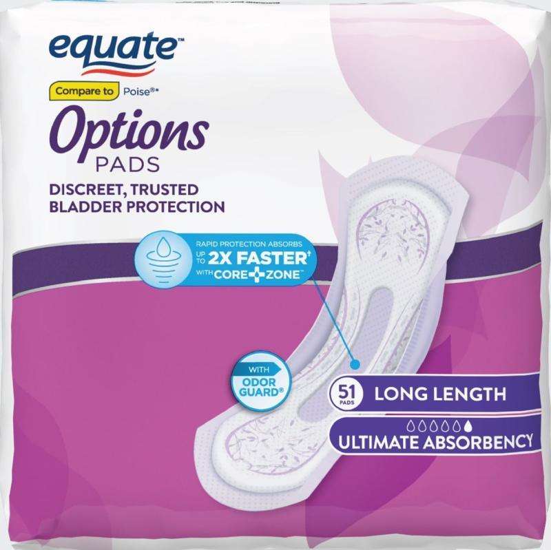 - Equate Options Incontinence Pads for Women, Ultimate Absorbency, Long Length (51 Count)