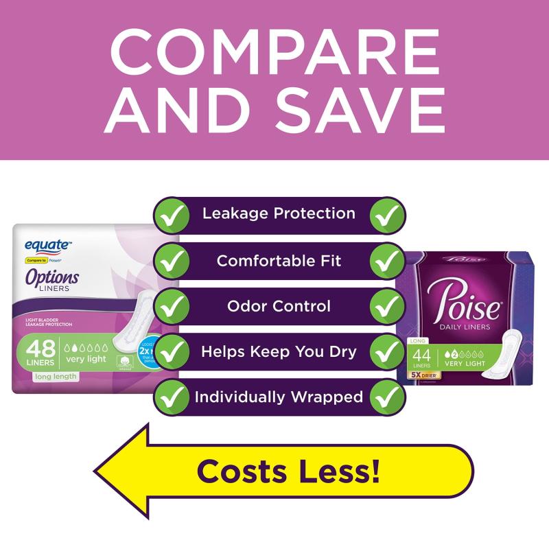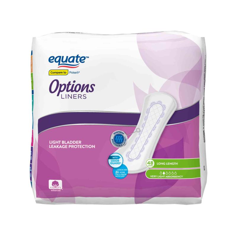 - Equate Options Incontinence Liners for Women, Very Light, Long, 48 Count