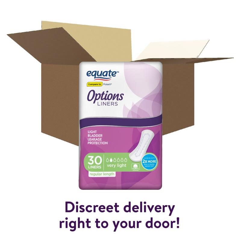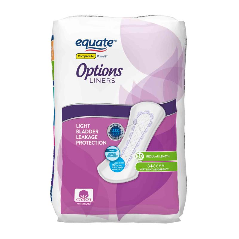 - Equate Options Women's Incontinence Regular Length Liners, Very Light Absorbency, 30 Count