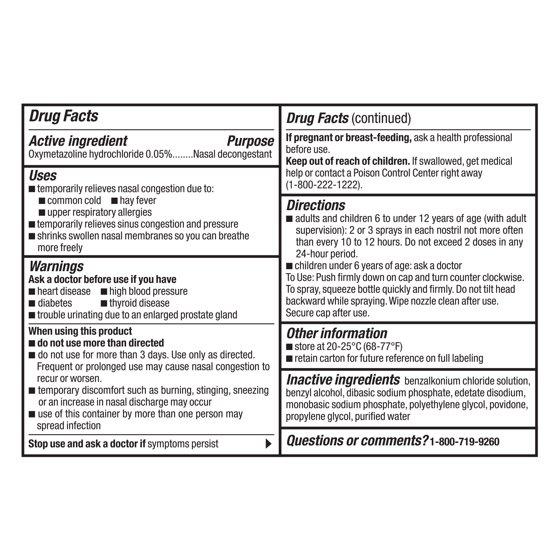 Compare to the active ingredient of Afrin Original. Equate Maximum Strength Nasal Spray provides fast, powerful congestion relief for allergies and colds for up to 12 hours. The active ingredient is oxymetazoline hydrochloride 0.05 percent, the Number One doctor recommended adult nasal spray active ingredient (of U.S. physicians surveyed by an independent market research firm). Clears stuffy noses fast. Temporarily relieves nasal congestion due to: common cold; hay fever; upper respiratory allergies; temporarily relieves sinus congestion and pressure; shrinks swollen nasal membranes so you can breathe more freely. This nose spray soothes as it relieves. Gluten free. Steroid free. For adults and children 6 to under 12 years of age (with adult supervision).