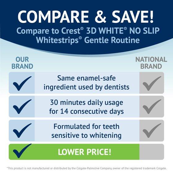 - COMPARE: If you like Crest 3D White No Slip Whitestrips, Gentle Routine, give Equate Premium Sensitive Teeth Whitening Strips a try; give yourself a whiter smile in 2 weeks