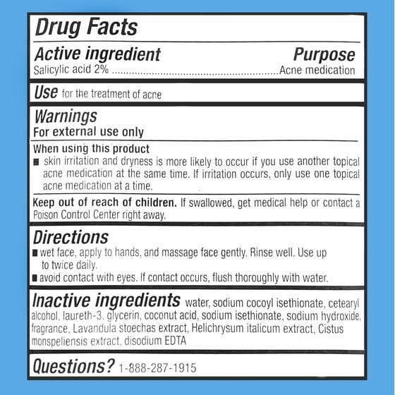 Active Ingredient: Salicylic Acid 2%, Inactive Ingredients: Water, Sodium Cocoyl Isethionate, Cetearyl Alcohol, Laureth-3, Glycerin, Coconut Acid, Sodium Isethionate, Sodium Hydroxide, Fragrance, Lavandula Stoechas Extract, Helichrysum Italicum Extract, Cistus Monspeliensis Extract, Disodium EDTA