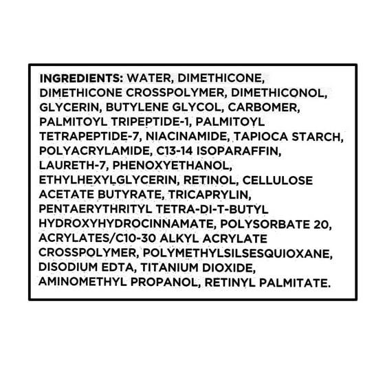 Water, dimethicone, dimethicone crosspolymer, dimethiconol, glycerin, butylene glycol, carbomer, palmitoyl tripeptide-1, palmitoyl tetrapeptide-7, niacinamide, tapioca starch, polyacrylamide, c13-14 isoparaffin, laureth-7, phenoxyethanol, ethylhexylglycerin, retinol, cellulose acetate butyrate, tricaprylin, pentaerythrityl tetra-di-t-butyl hydroxyhydrocinnamate, polysorbate 20, acrylates/c10-30 alkyl acrylate crosspolymer, polymethylsilsesquioxane, disodium edta, titanium dioxide, aminomethyl propanol, retinyl palmitate