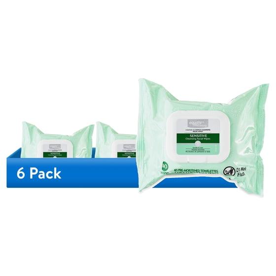 (6 pack) Equate Sensitive Cleansing Facial Towelette Wipes for Face Care of Sensitive Skin, Alcohol Free, 40 Count, Compare to Simple® Cleansing Facial Wipes