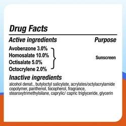 Avobenzone, homosalate, octisalte, octocrylene, alcohol denat., butyloctyl salicylate, acrylates/octylacrylamide copolymer, panthenol, tocopherol, fragrance, stearoxytrimethylsilane, caprylic/capric triglyceride, glycerin