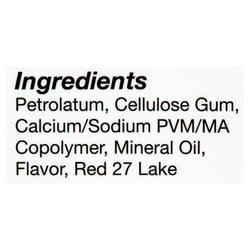 Petrolatum, Cellulose Gum, Calcium/Sodium PVM/MA Copolymer, Mineral Oil, Flavor, Red 27 Lake