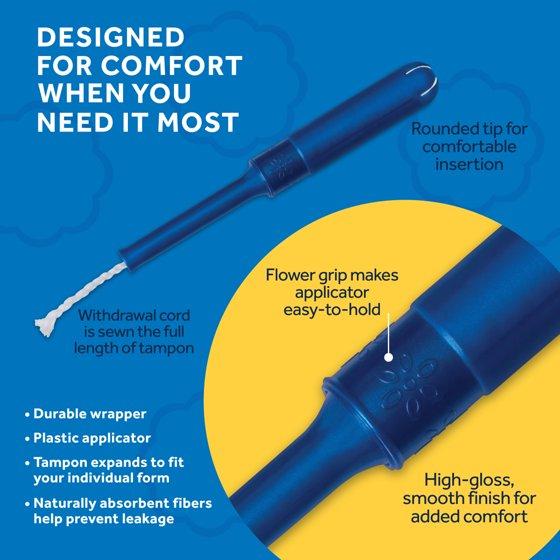 - Premium BPA-Free plastic tampon applicators with rounded tip, smooth finish, and easy-to-hold flower grip