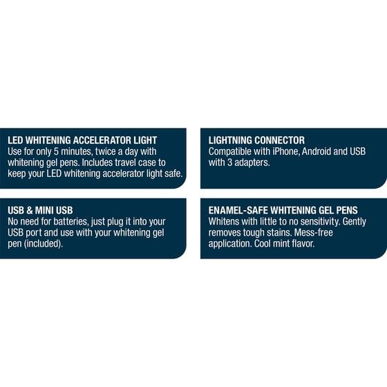- Includes: four (4) teeth whitening pens (up to 6 months of whitening), LED whitening accelerator light, lightning connector, USB and mini USB, and travel case