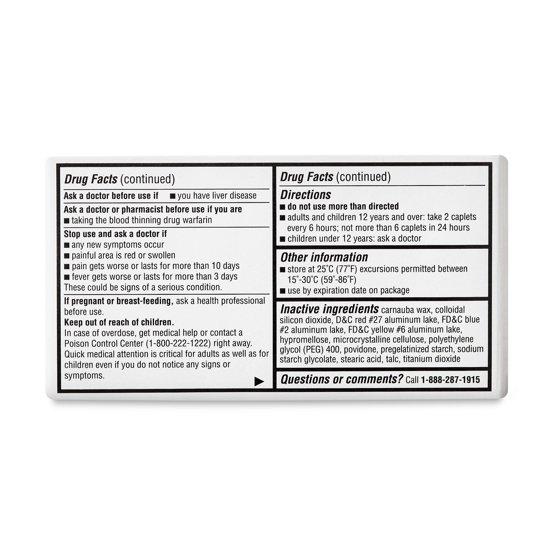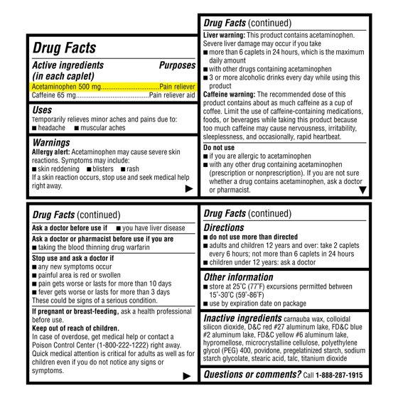 Acetaminophen 500mg, Caffeine 65mg per caplet
