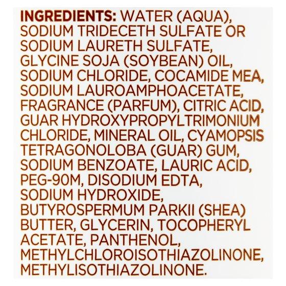 Water (Aqua), Sodium Trideceth Sulfate or Sodium Laureth Sulfate, Glycine Soja (Soybean) Oil, Sodium Chloride, Cocamide Mea, Sodium Lauroamphoacetate, Fragrance (Parfum), Citric Acid, Guar Hydroxypropyltrimonium Chloride, Mineral Oil, Cyamopsis Tetragonoloba (Guar) Gum, Sodium Benzoate, Lauric Acid, Peg-90M, Disodium Edta, Sodium Hydroxide, Butyrospermum Parkii (Shea) Butter, Glycerin, Tocopheryl Acetate, Panthenol, Methylchloroisothiazolinone, Methylisothiazolinone