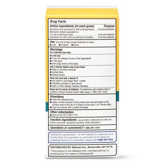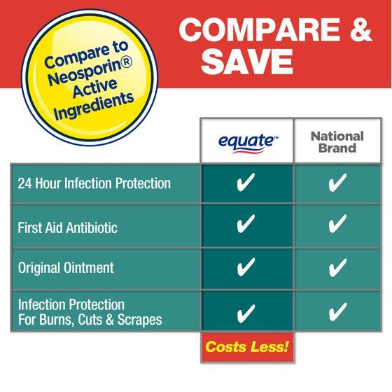 Compare to Neosporin active ingredients. Equate First Aid Triple Antibiotic Ointment provides long-lasting, 24-hour infection protection for minor cuts, scrapes and burns. This original strength ointment helps skin heal, resulting in healthy looking skin. Contains bacitracin zinc, neomycin sulfate and polymyxin B sulfate - the number one doctor recommended combination of active ingredients in the U.S. (of U.S. physicians surveyed by an independent market research firm). Enhanced with vitamin E and cocoa butter, this first aid ointment can be applied one to three times per day and used with a clean bandage. Cuts, burns and scrapes need long lasting protection against infection. Trust first aid antibiotic ointment to care for your minor wounds.