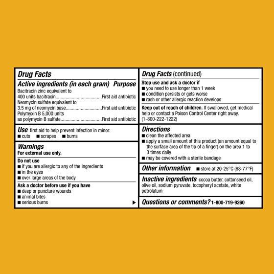 Active ingredients (in each gram): Bacitracin zinc equivalent to 400 units bacitracin; Neomycin sulfate equivalent to 3.5 mg of neomycin base; Polymyxin B 5,000 units as polymyxin B sulfate. Inactive ingredients: cocoa butter, cottonseed oil, olive oil, sodium pyruvate, tocopheryl acetate, white petrolatum.