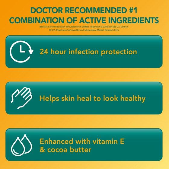 Compare to Neosporin active ingredients. Equate First Aid Triple Antibiotic Ointment provides long-lasting, 24-hour infection protection for minor cuts, scrapes and burns. This original strength ointment helps skin heal, resulting in healthy looking skin. Contains bacitracin zinc, neomycin sulfate and polymyxin B sulfate - the number one doctor recommended combination of active ingredients in the U.S. (of U.S. physicians surveyed by an independent market research firm). Enhanced with vitamin E and cocoa butter, this first aid ointment can be applied one to three times per day and used with a clean bandage. Cuts, burns and scrapes need long lasting protection against infection. Trust first aid antibiotic ointment to care for your minor wounds.