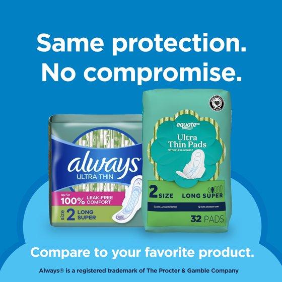 - Equate Ultra Thin, Size 2, Long Super Pads with Flexi-Wings, 32 Count