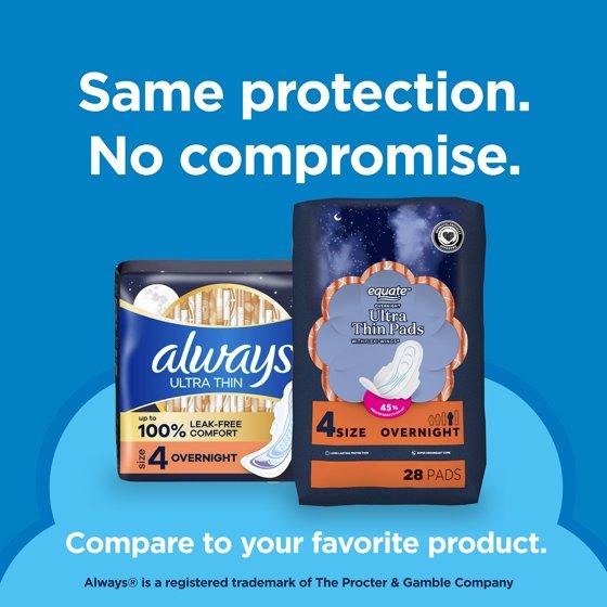 Equate Ultra Thin Pads with Wings, Size 4, Overnight Absorbency, Compare to Always (28 Count)