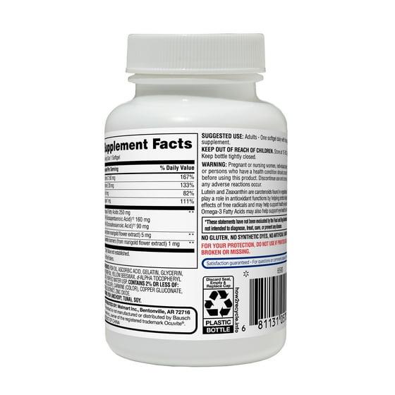 Our Equate Vision Formula 50+ Softgels is an eye health vitamin and mineral supplement that is ideal for people over 50 and may support macular health and retinal function.* Omega-3 fatty acids and the natural 5-to-1 ratio of lutein and zeaxanthin may help to protect against the effects of free radicals and provide powerful antioxidants that help promote eye health and function.* These once-per-day supplements contain no gluten, lactose, synthetic dyes, or artificial flavors. See your way to better vision and eye health with Equate Vision Formula 50+ Softgels Dietary Supplement!*