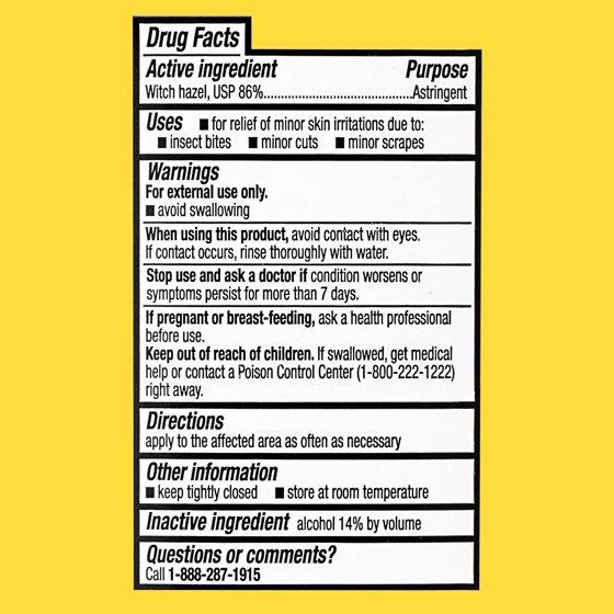 - Active ingredient: Witch hazel, USP 86% – Astringent