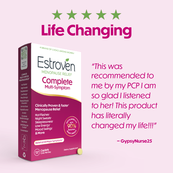 Is menopause putting a pause on you living your best life? For all-in-one Menopause relief try Estroven Complete Menopause Relief, with a clinically demonstrated ingredient to reduce multiple menopause symptoms with results in as little as 28 days. Trust Estroven for all your Menopausal needs. Estroven is the top selling brand for menopause relief, and the top pharmacist-recommended brand. Estroven Complete Menopause Relief contains naturally sourced ERr 731 Rhapontic Rhubarb Extract, which has been clinically shown to relieve all menopause symptoms tested.Reduces hot flashes and night sweats, supports restful sleep, boosts energy, helps to manage daily stressors, mood and irritability, promotes joint and muscular comfort, and supports urinary and bladder health. All-in-one relief with just one small daily caplet. No two women experience Menopause the same way. Try Estroven Complete Menopause to help relieve your most bothersome symptoms and take your life back.*