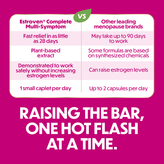 Is menopause putting a pause on you living your best life? For all-in-one Menopause relief try Estroven Complete Menopause Relief, with a clinically demonstrated ingredient to reduce multiple menopause symptoms with results in as little as 28 days. Trust Estroven for all your Menopausal needs. Estroven is the top selling brand for menopause relief, and the top pharmacist-recommended brand. Estroven Complete Menopause Relief contains naturally sourced ERr 731 Rhapontic Rhubarb Extract, which has been clinically shown to relieve all menopause symptoms tested.Reduces hot flashes and night sweats, supports restful sleep, boosts energy, helps to manage daily stressors, mood and irritability, promotes joint and muscular comfort, and supports urinary and bladder health. All-in-one relief with just one small daily caplet. No two women experience Menopause the same way. Try Estroven Complete Menopause to help relieve your most bothersome symptoms and take your life back.*