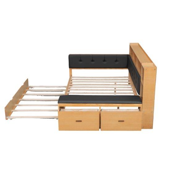 Euroco Wood Full Size Daybed with Trundle and Drawers, Storage Bed with Upholstery Bench and Headboard, Charging Station and Shelves, Natural