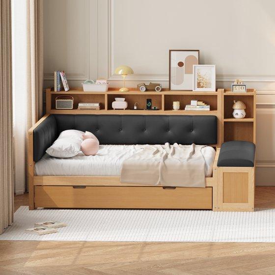 The EUROCO Wood Full Size Daybed with Trundle is a masterclass in space-saving versatility and smart design. Functioning as both a chic living room sofa and a full-size bed with an extra twin size trundle, it effortlessly adapts to daily needs and guest stays. Its exceptional storage capacity, through under-bed drawers and integrated shelves, helps maximize organization. Added comfort is provided by the upholstered headboard and bench seating, while a modern charging station adds essential convenience. Built from durable wood with a natural finish, this all-in-one piece is the perfect solution for studios, guest rooms, or multi-functional spaces seeking style, storage, and supreme utility.