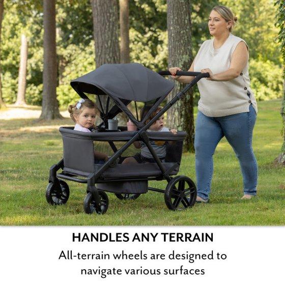 The Evenflo Omni Crew Stroller Wagon combines the ease of a stroller and the spaciousness of a wagon. It allows for easy push and pull transitions and is ideal for families who need flexibility for outings. Suitable for two kids, it holds up to 55 pounds each. Compatible with Evenflo LiteMax and Shift DualRide car seats, it ensures your baby's safety. With a UPF 50+ canopy, the stroller wagon offers sun protection. Its all-terrain wheels and compact folding feature make it perfect for storage and travel.