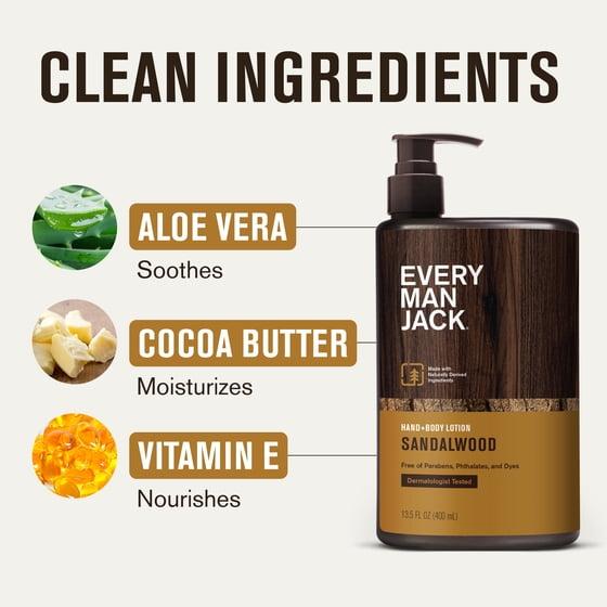Every Man Jack Mens Sandalwood Hand & Body Lotion for All Skin Types - Dermatologist Tested & Hypoallergenic - Nourish Skin with Lightweight Fast Absorbing Natural Lotion - 13.5oz