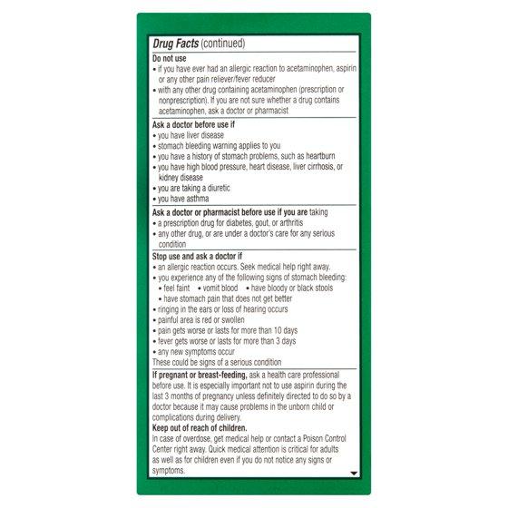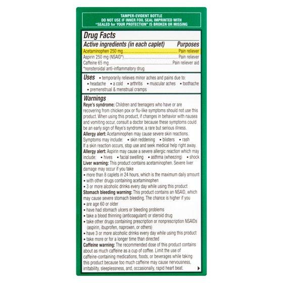 Active Ingredients: Acetaminophen (250 mg), Aspirin (250 mg)(NSAID), Caffeine (65 mg). Purposes: Pain Reliever; Pain Reliever, NSAID Nonsteroidal Anti-Inflammatory Drug; Pain Reliever Aid. Inactive Ingredients: Benzoic Acid, Carnauba Wax, FD&C Blue 1, Hydroxypropylcellulose, Hypromellose, Light Mineral Oil, Microcrystalline Cellulose, Polysorbate 20, Povidone, Propylene Glycol, Simethicone Emulsion, Sorbitan Monolaurate, Stearic Acid, Titanium Dioxide.