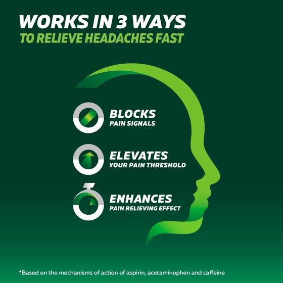 Excedrin Extra Strength Headache Relief Caplets alleviate various types of pain fast. Excedrin works in 3 ways to relieve headaches: it blocks pain signals, elevates your pain threshold and uses caffeine to enhance the pain relief effect. Available in convenient caplet form, this non-prescription pain medicine works as hard as you do, combining aspirin and acetaminophen with caffeine. These active ingredients create a powerful formula with two pain relievers and a booster to offer temporary relief of aches and pains caused by headaches, colds, premenstrual and menstrual cramps, toothaches, muscular aches and arthritis. For some, relief with this Excedrin caplets can start working in 15 minutes. Get headache relief fast with Excedrin, the headache expert.