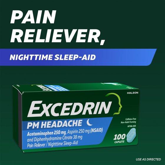 Excedrin PM Pain Reliever and Nighttime Sleep-Aid Caplets give you fast nighttime headache relief, plus a good night's sleep. This triple action formula combines two effective pain relievers with a nighttime sleeping aid. The active ingredients aspirin, acetaminophen and diphenhydramine citrate work together to provide temporary relief of pain associated with headaches, body pain and muscle aches accompanied by sleeplessness. Excedrin PM features a caffeine-free formula that won't keep you awake. This non-prescription pain relief medicine is available in convenient caplet form. End nighttime headaches fast with Excedrin, the headache expert.