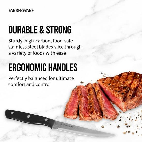 The Farberware Classic Steak Knife Set of 4 is a dining essential, ideal for either everyday dining or entertaining. The steak knife blades feature superior high carbon stainless steel blades for strength and durability resulting in sharp cutting performance. The Farberware knife set has every knife perfectly weighted and balanced for optimum control. Steak knife handles have a comfortable handle for a sure grip. Our steak knives have blades measuring 4.5 inches. So, they are designed to cut through multiple cuts of steak, chicken, chops, and more! Hand-wash your knives using a mild detergent; rinse and dry immediately.