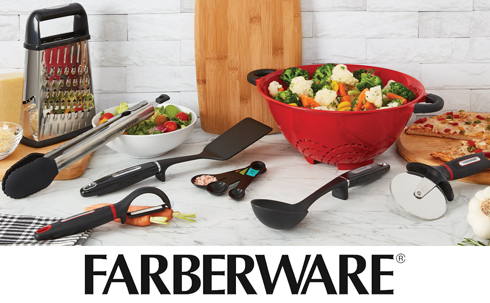 - Founded over 100 years ago, Farberware has always stood for value, quality and durability. It's no wonder that they are the best-selling cutlery brand in America today. From knives and cutting boards to pantryware and gadgets, each item in the Farberware family of products is designed with you in mind and is built to the highest standards. Farberware offers a complete line of tools and gadgets, from classic to contemporary, for all of your food preparation tasks. With everything from a set of measuring spoons for precise cooking to an odor-absorbing splatter screen that protects you from splatters and cooking aromas. Farberware tools and gadgets are designed to make cooking enjoyable and efficient. Lifetime Limited Warranty Farberware items are warranted to be free from defects in material and workmanship. Any piece found to be defective under normal use and care will be repaired or replaced at no charge with the same items or an item of equal or better value. For more information, please see packaging or call 1-800-999-2811 for complete warranty information. Farberware Soft-Grip Stainless Steel 9-inch Locking Kitchen Tongs: 83395-93