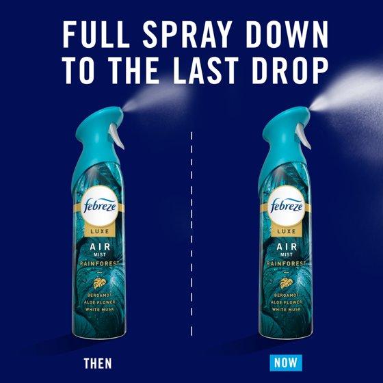 In even the cleanest homes, everyday odors are inevitable, and those odors can affect the enjoyment of being in your home. Febreze Air Mist is the go-to room deodorizer for tackling those unwanted smells. It's designed to instantly restore any space with the just-cleaned freshness you love. Made with powerful odor fighters, you can spray away stink confidently-whether you're in the kitchen, bathroom, garage, living room, or any room where bad smells happen. No need for a passport when Luxe Rainforest whisks you away with the exotic aroma of bergamot, aloe flower, and white musk. And with over 40 scents to choose from, you can breathe happy for up to 6 hours of ahh-mazing scent. This air freshener has 100% natural propellant, and a nozzle that delivers full sprays to the last drop, so nothing goes to waste. Next time odors bring you down, grab the odor-fighting power and long-lasting scent of Febreze Air Mist.