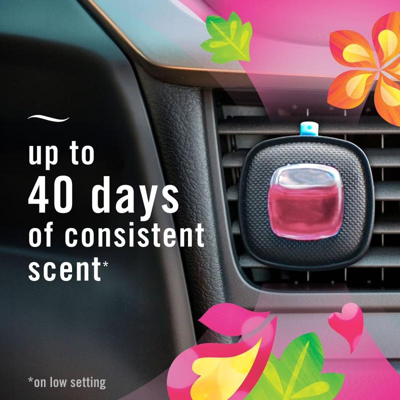 | Instructions | 1. Activate: To activate scent, firmly push clip up until you hear it click in place. 2. Clip: Then clip product to car vent. 3. Adjust: To control freshness, adjust scent intensity dial. |
