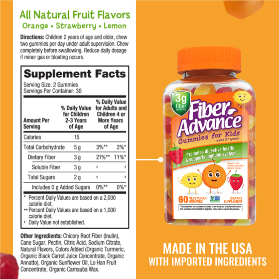 Fiber Advance Kids Digestive Health Fiber Supplement Gummies, Natural Fruit, Fiber Advance Daily Kids Fiber Gummies are the simplest, best-tasting way for kids to take fiber. Our delicious and easy to chew gummies let your little ones get the fiber they need without the mess of powdered products and in a fraction of the time. Non-GMO and Vegetarian, Fiber Advance gummies are made without the use of gluten, artificial flavors, or added preservatives. These easy to take gummies are the perfect way to promote regularity in a no-mess way you can feel good about. With 3g of fiber in just 2 gummies, Fiber Advance Daily Kids Fiber Gummies are the perfect way to provide your child with the fiber they need in a way they'll love.