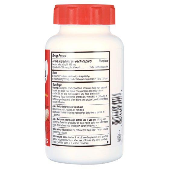 Active Ingredients: (In each caplet) Calcium Polycarbophil 625 mg Equivalent to 500 mg Polycarbophil Bulk-Forming Laxative; Inactive Ingredients: Caramel, Crospovidone, Hypromellose, Magnesium Stearate, Microcrystalline Cellulose, Polyethylene Glycol, Silicon Dioxide, Sodium Lauryl Sulfate.