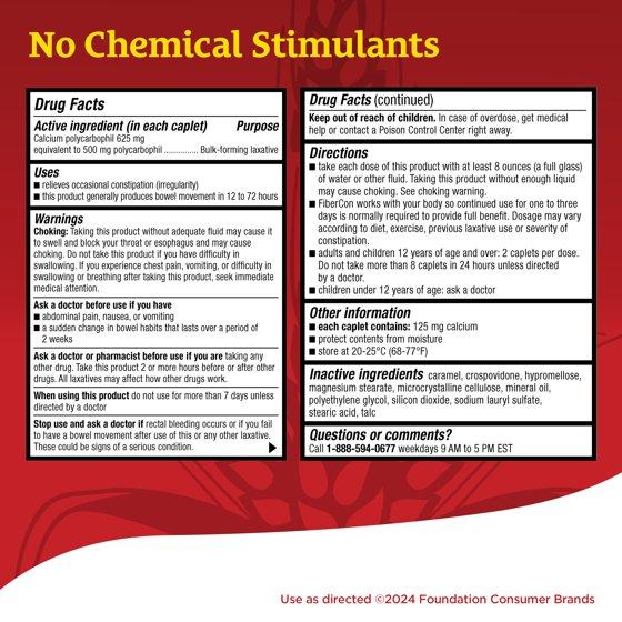 - NO CHEMICAL STIMULANTS: The insoluble fiber in Fibercon acts like natural fiber to help control and maintain normal bowel function. Fibercon does not have chemical stimulants and the cramping associated with them.