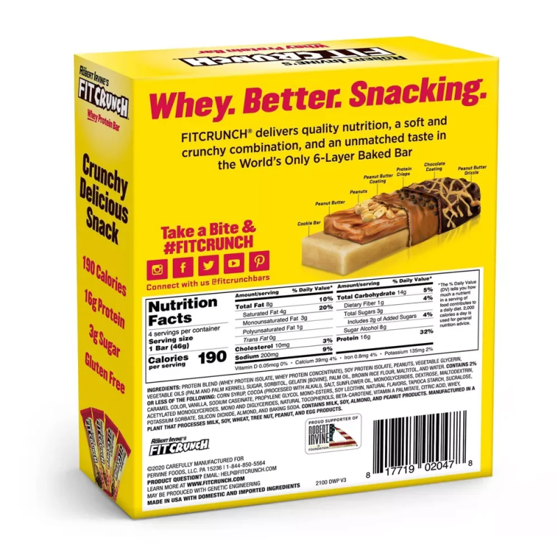 Stop cravings in their tracks with a truly-delicious baked protein bar created by celebrity chef Robert Irvine. Every FITCRUNCH® Chocolate Peanut Butter bar starts with a soft-baked cookie bar that’s topped with some delicious layers of peanut butter, peanuts, peanut butter coating, crunchy protein crisps, chocolatey goodness, and a peanut butter drizzle. This classic combination of peanut butter and chocolate provides quality nutrition and a taste that you’d only expect from a chef. FITCRUNCH® makes getting your protein more enjoyable than ever before.