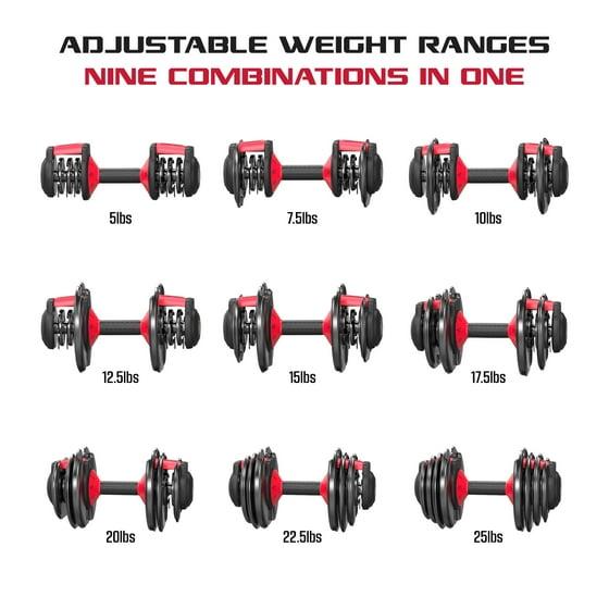 - Quick-select adjustable dumbbell with a weight range of 5-25 lbs in 2.5 lbs increments