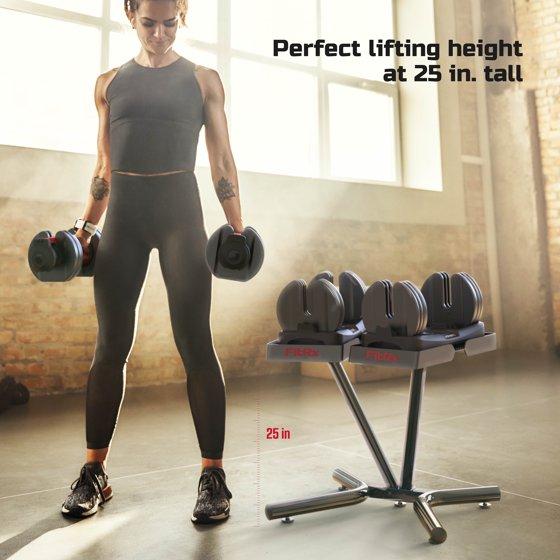 - Set includes weight rack with two adjustable dumbbells